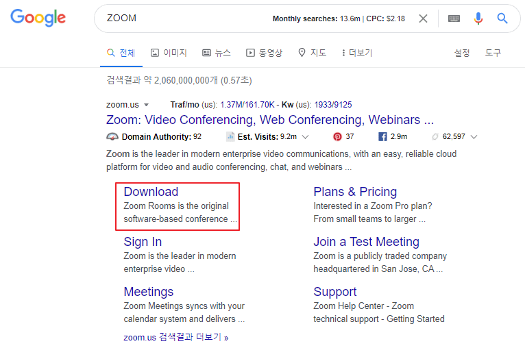 ZOOM 검색하셨으면 최상단 홈페이지 밑에 Download를 클릭합니다.