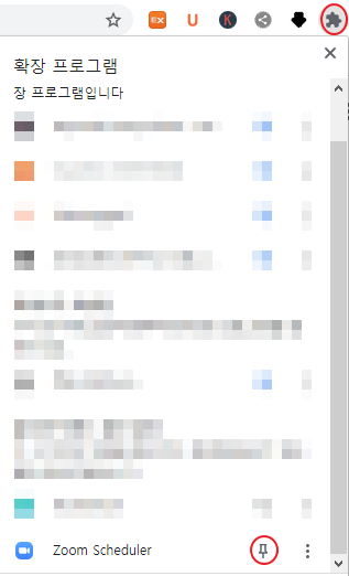 3. 크롬 우측 상단 퍼즐 모양 클릭 - Zoom Scheduler 옆 압정 모양 클릭